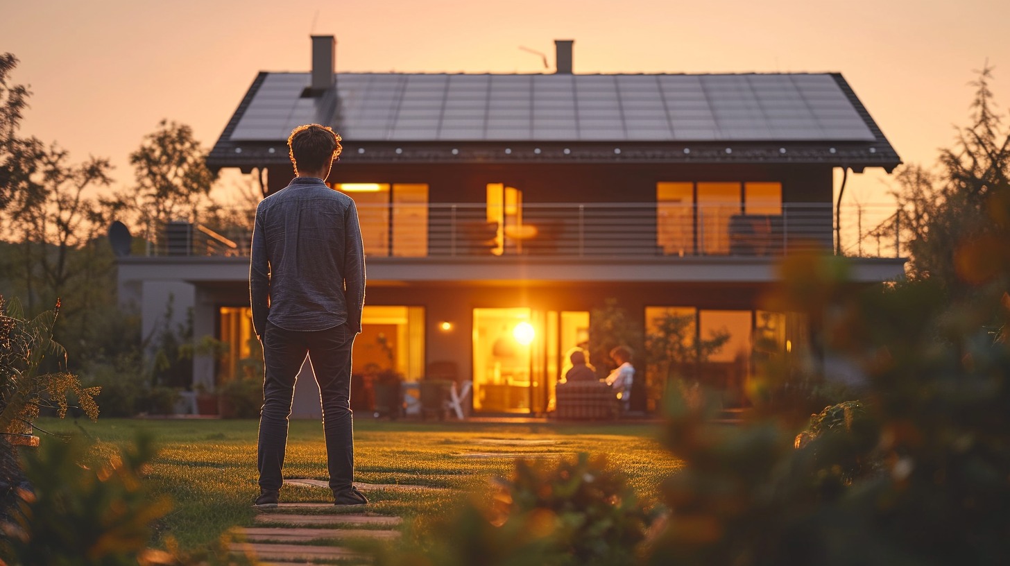 透過窗戶,可以看到屋頂上已經安裝好的太陽能板,它們在陽光下閃閃發光,象徵著再生能源的力量。